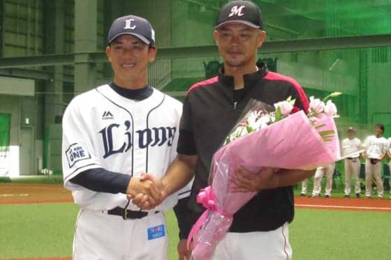 西武・松井稼頭央2軍監督から花束を送られたロッテ・福浦和也【写真:安藤かなみ】