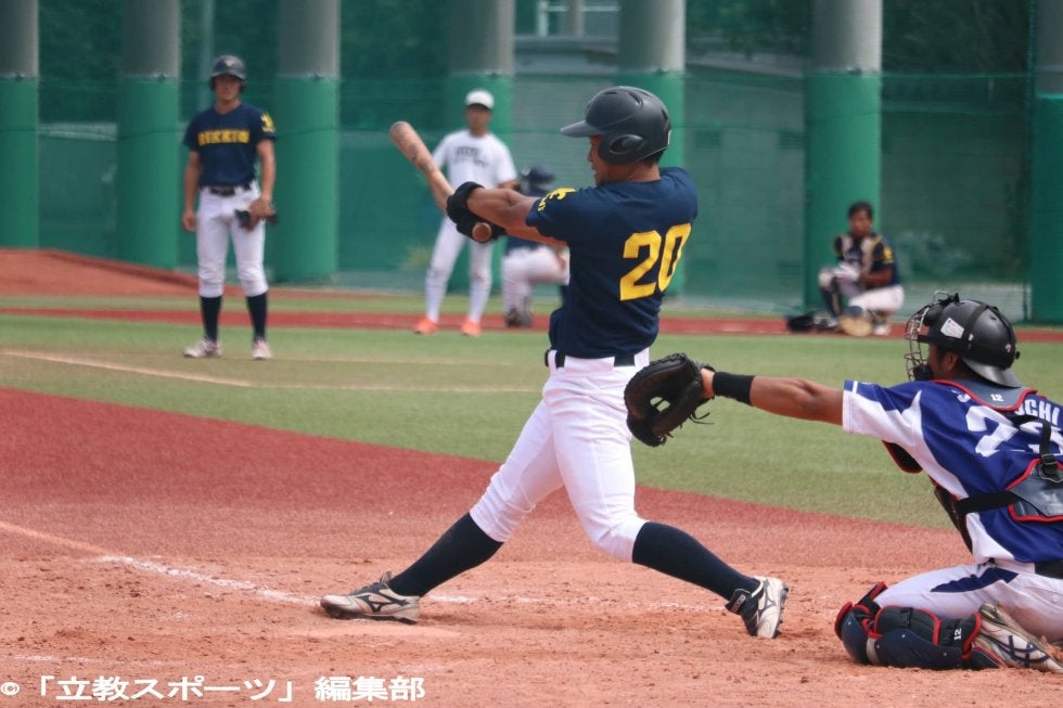今日の主役は柴田だ。先頭で迎えた第1打席、変化球を上手く捉え、右中間への二塁打を放つ。その後犠打で進塁し、迎える打者は冨永(コ3=桐蔭学園)。初球を打つが、ボテボテのあたりになってしまった。しかし、俊足をとばして、内野安打にする。その間に柴田が生還し、先制点を獲得。5回にも柴田は直球をはじき返し、左中間への二塁打で出塁する。チャンスメイクを演出して、今日はここでお役御免。追加点を獲得することはできなかったが、スタメンに抜擢され結果を残した。