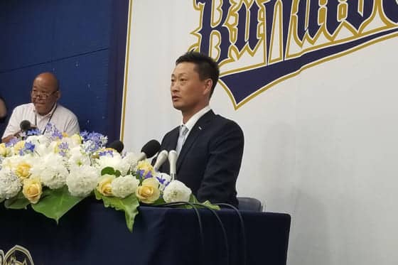 引退会見に臨んだオリックス・岸田護【写真:橋本健吾】