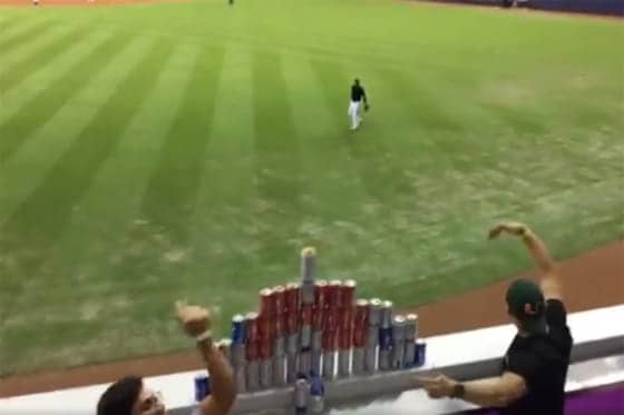 外野ファンスに作ったビール缶ピラミッドにボールを投げるよう催促するファン(画像はスクリーンショットです)