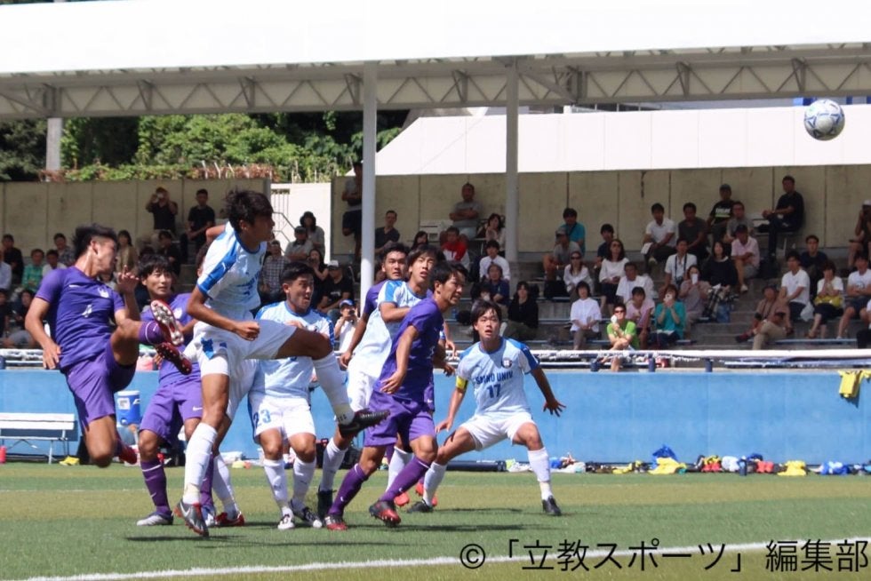 関東2部リーグ後期開幕戦が15日に行われた。産能大と対戦した立大は38分に井浦(済4=東久留米総合)のヘディングゴールで先制するも、56分に失点し引き分けに終わった。勝ち点を獲得したのは4試合ぶりで、第9節以降続く連敗は「3」でストップしたが、順位は変わらず11位と降格圏内に沈んでいる。