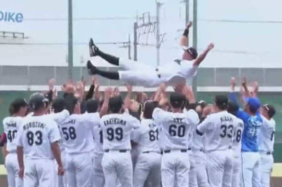 胴上げされるロッテ・福浦和也【画像:パーソル パ・リーグTV】