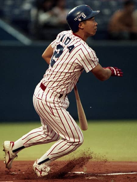 1990年代にヤクルトのリードオフマンとして活躍した飯田 photo by Sankei Visual