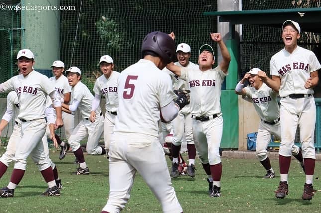 サヨナラ勝ちを収め、喜ぶ早大ナイン