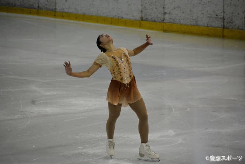 ショート7位の鈴木星佳(総4・慶應湘南藤沢)は第3グループに登場。これまで借りた衣装やお下がりが多かったという鈴木は、「高校生ぶりの自分だけの衣装」である、和を意識した真っ赤な新衣装で氷上を舞う。冒頭のトリプルサルコウ、ダブルトゥループのコンビネーションジャンプを綺麗に着氷すると、続くダブルアクセルや、トリプルトゥループ、 ダブルトゥループのコンビネーションジャンプも流れるように決め、客席からは歓声があがる。その後のトリプルトゥループで転倒、アクセルジャンプがシングルになるなどミスが連続するも、ラストでは調子を取り戻し、コンビネーションジャンプやレベル4のスピンを成功させて演技を終えた。加えて、「今年から研究してきた」という体を大きく使ったダイナミックかつ情感たっぷりの表現で、演技構成点において全体で3位の高得点を叩き出し、フリーは86.64点、トータルで134.65点。演技終了時点で3位につけた。このとき、まだ滑っていない選手はあと7人。自動的にボーダーラインである14位より上位となることとなり、3年ぶりの東日本選手権進出を決め、笑顔を見せた。最終順位は7位。これから立ち向かっていく大きな試合でも、フリーの楽曲である「篤姫」のように最後まで強く美しく戦う姿を期待したい。