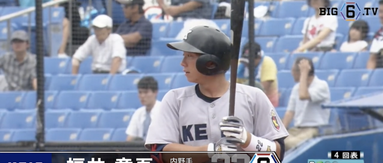 慶大・福井(②大阪桐蔭)がソロホームラン、さらに強烈なライト前ヒットを放ちチームに勢いを与えた。