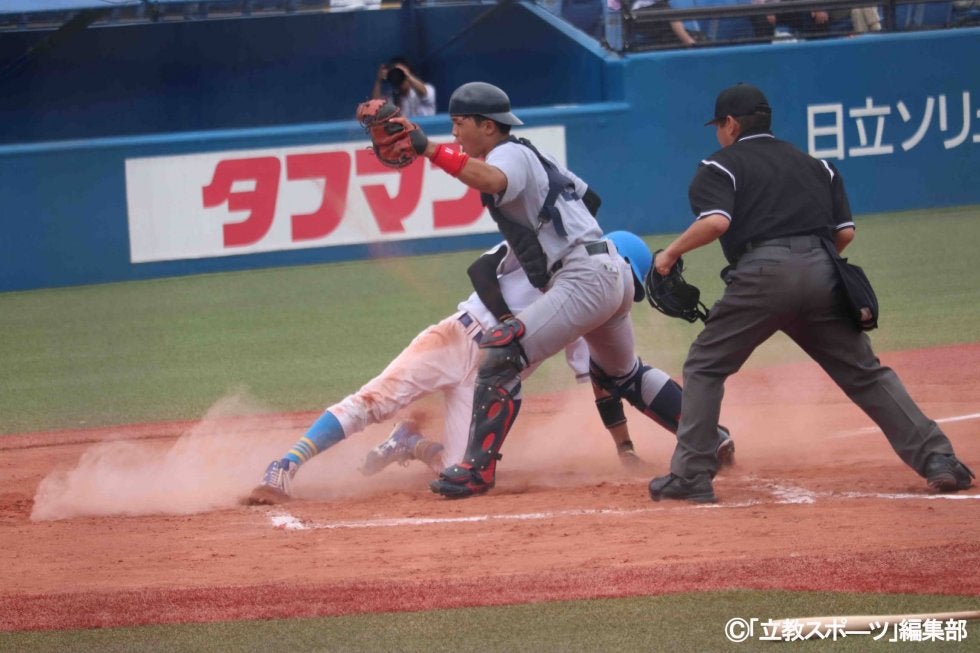 ホームでタッチアウトにする郡司(仙台育英=4年)初戦を落とし、厳しいスタートとなった。「優勝する上で絶対落とせない試合な…