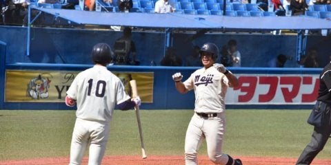 満塁弾の明大・喜多は試合後「自分たちしか連覇の権利はないので、明治らしい野球をしたい」と語った投打のかみ合った明大が4対…