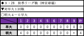 (明)◇犠打3 村松(1回)、西野(2回)、内山(6回) ◇併殺1 ◇残塁5 ◇盗塁1 添田(5回) ◇失策0