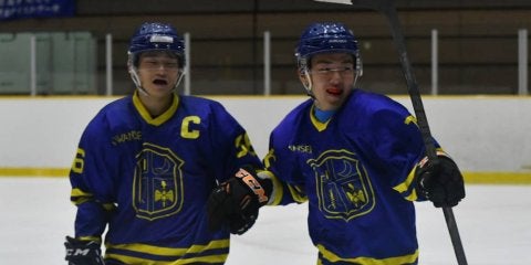 <写真・第2Pに勝ち越しゴールを挙げたFW舩谷(右)> 9月28日、滋賀県立アイスアリーナにて第66回関西学生アイス…