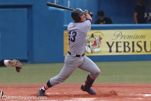 打線は2回。2本の安打と死球で1死満塁の好機をつくると、瀬戸西純(3年)の二ゴロの間に三塁走者がかえり先制。さらに併殺を試みた相手遊撃手が一塁へ暴投。この間にもう1人が生還し、2点を先取した。先発の髙橋祐樹(4年)も3回を打者9人で抑え、順調な滑り出しだと思われたが4回。立大打線につかまった。先頭の宮﨑仁斗(1年)と3番・太田英毅(2年)に、それぞれ左越え本塁打を浴び、試合は振り出しに。次打者に二塁打を許すと、その後暴投も絡み1死三塁。さらにピンチを招いた。すると5番・江藤勇治(4年)に中前へと運ばれ、逆転を許す。髙橋佑に代わってマウンドに上がった津留﨑大成(4年)がわずか1球で火消しに成功したが、1点のビハインドを背負ったまま試合を折り返した。