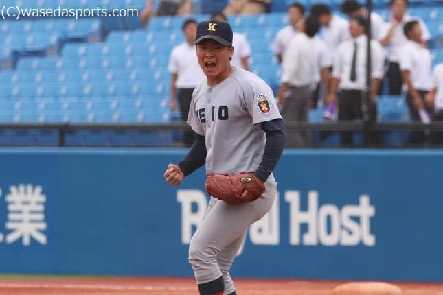 反撃の機会をうかがう慶大。6回、ついにその時が訪れた。この回先頭の柳町達副将(4年)が右中間を破る二塁打で出塁すると、続く郡司が左翼線を破る適時二塁打を放ち、たちまち同点に。その後あっさり2死となったが、慶大応援席は総立ちで声援を送る。すると7番・嶋田に右翼フェンス直撃の一打が飛び出す。郡司が生還し勝ち越しに成功した。 ところが終盤、守りでは得点圏に走者を置く場面が続く。7回には窮地でマウンドを託された3番手・髙橋亮吾(4年)が2死一、三塁のピンチを背負うも、見逃し三振に抑えガッツポーズ。さらに土壇場の9回、抑えを任された石井雄也(4年)も2死三塁という一打同点のピンチを招いた。それでも緊迫した状況の中、最後の打者を力強い直球で見逃し三振に切って取る。試合終了の瞬間、つい先ほどまでの緊張を押し返すように、神宮球場は一気に沸き上がった。