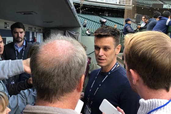 29日の本拠地アスレチックス戦を前に取材に応じたディポトGM