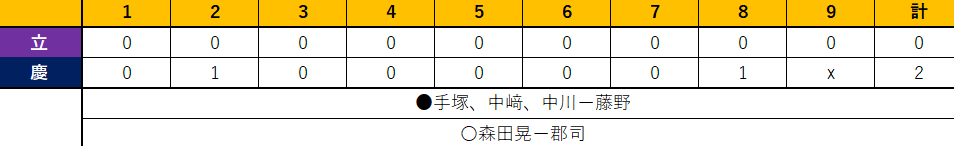 負けたら優勝まであとがない状況で何としても勝って、明日の誠也さんに繋げたいなという思いで臨みました。相手の投手がすごくよくて、野手陣が打てなかったというのもありますし、投手陣の粘りが足りない事もありました。少しの差で勝ち負けがついたなと思います。(連投の疲れは)それはあるとは思うんですけど、リーグ戦始まる前から毎試合使うと監督から言われていて、それに向けて準備してきたので、特に驚きはないです。4連敗という悪い流れできていて、次は負けられない戦いになるのでしっかり空き週有意義な時間を作ります。東大戦は投手陣も抑えて、野手陣も多く得点をとって、次の週の相手にも勢いをつけていけるように頑張っていきます。