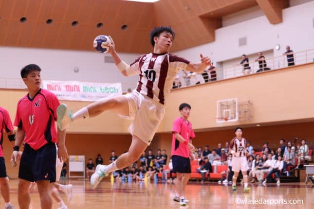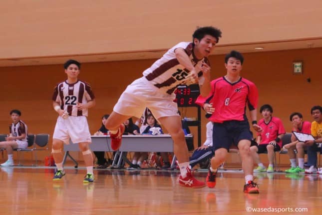 前半開始直後から早大のディフェンスは噛み合わない。先制点を2点も献上してしまうと、3回連続でゴールネットを揺らされる。2−5と日大に引き離され、早大はたまらずタイムアウト。直後にLB青沼健太(社2=千葉・昭和学院)が高い位置からのジャンプシュートを決めると、徐々に早大は得点が入り始める。気持ちを切り替え試合に臨む早大だが、ディフェンスは相変わらず相手オフェンスの動きに翻弄され止めきることができない。7−11となかなか点差は縮まらず、刻々と時間がすぎていき前半戦は残り10分に。しかし、ここでワセダセブンの底力が見られる。青沼が連続して相手ゴールにシュートをたたき込むと、ディフェンスもそれに呼応するかのごとく日大にシュートを打たせない。早大はその後の7mスローも決めきるとなんと1点差まで迫り切った。焦る日大のディフェンスがますます激しさをます中、主将としての意地を見せRW清原秀介(商4=東京・早実)が相手ゴールを揺らし同点に。最後、相手に7mスローを決められ逆転を許してしまったものの、なんとか日大に食らいつき12−13で前半を終えた。