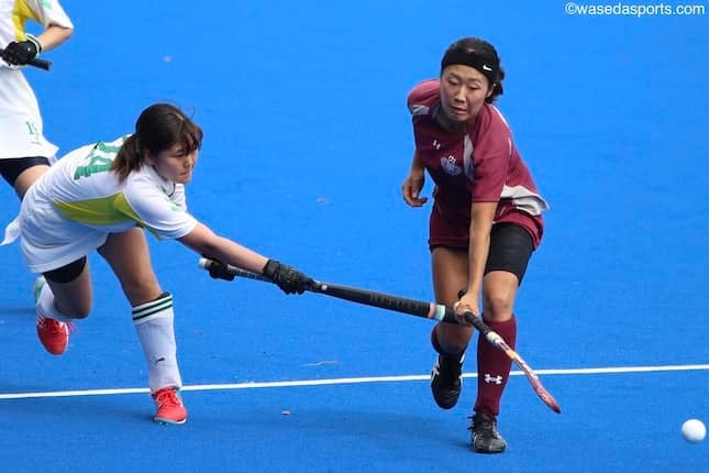 上智大のセンターパスで開始した第1Q。すると早々にサークル内まで攻め込まれる。しかし相手のパスをカットして攻撃の流れを引き寄せると、MF南家未来(教3=京都・立命館)を中心に攻め、早大のペースに持ち込む。開始5分からはサークル内まで攻め込み果敢にシュートを放つが、相手の積極的な守備にパスをカットされ、ゴールを奪うことはできなかった。続く第2Q。開始1分で相手にペナルティーコーナー(PC)を取られるが、守り抜く。その数分後には早大もこのゲーム最初のPCを獲得。そのまま立て続けにPCのチャンスがあり、早大が攻めの流れに。3本目のPCではDF橋本実結(社3=東京・早実)からパスを受けた南家がゴール正面からシュート。しかしこれは相手のディフェンスに阻まれゴールならず。第2Qでは計4回のPCを獲得するが、チャンスを生かし切れず0-0で前半を終えた。
