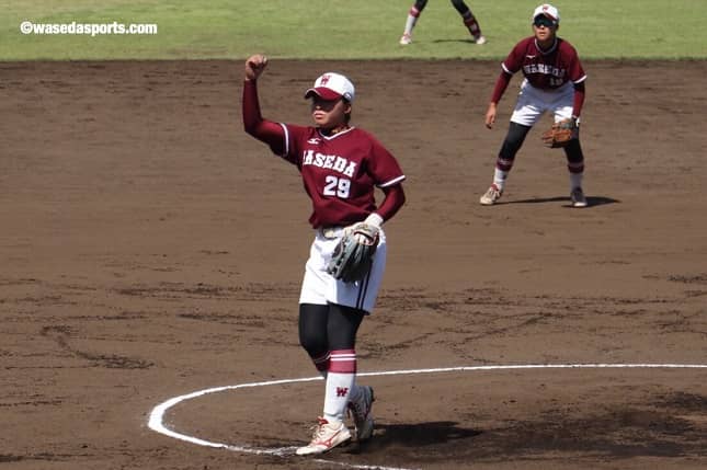 先発の増田侑季(スポ2=香川・高松商)は「自分の持ち味をかなり出せた」と初回から快調に飛ばしていき、いきなり三者凡退に抑える。続く2回も先頭打者こそ安打を許すものの、後続を完全に絶って無失点に封じるなど国士舘大打線を寄せ付けない。結局、6回まで毎回奪三振の無失点の好投を披露し、攻撃へのリズムを作った。