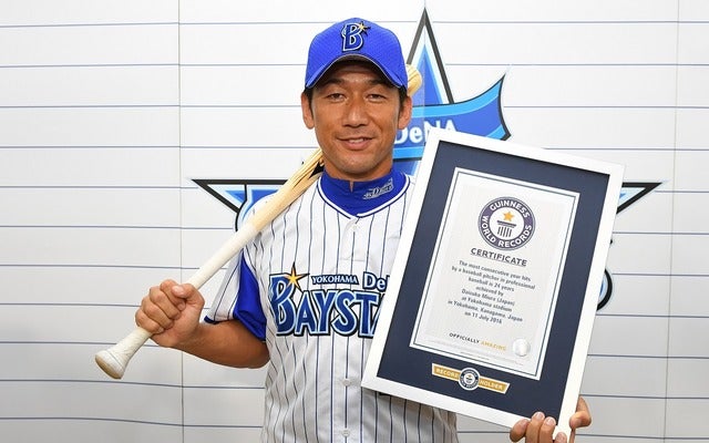 三浦は、2016年7月11日(月)に行われた対中日ドラゴンズ戦の2回裏2死1塁の場面で放った左前打により24年連続安打を記録。この記録が「プロ野球投手による安打最多連続年数」として、ギネス世界記録に認定された。