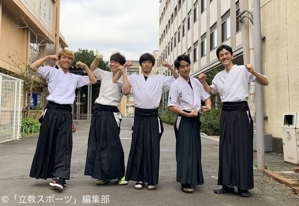 今大会で皆中した選手たち。左から高森(理1)、中宿(現2)、堀貫(済2)、渡辺(済3)、三浦(文4)