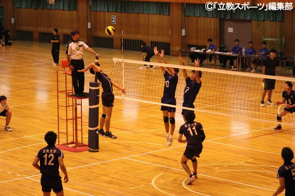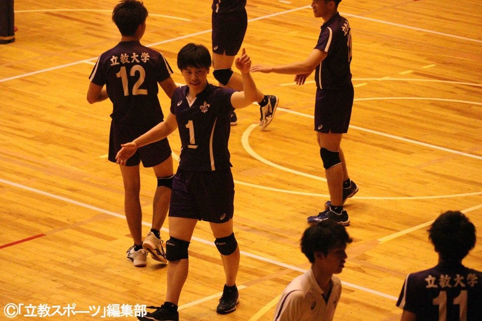 第1セット序盤、相手のミスが続き得点を重ねる。アスリート選抜の1年生の活躍も目覚ましく、12―8と立大4点リードで国武大がたまらずタイムアウト。しかし、その後も一度掴んだ流れは渡さない。ピンチサーバーとしてコートに入った#17笹本(観2)もしっかりと自分の役目を果たした。途中、相手に3連続ポイントを取られる場面もあったが、#1羽田(営4)のサーブが走り、再び巻き返す。最後は、#13井原(済1)の強烈なスパイクが決まり、25―23で第1セットを先取した。第2セットも次々にスパイクが決まり、波に乗る。確実にブロックアウトを取り、得点を重ねる冷静さも見せ、このセットも25―17で奪取した。