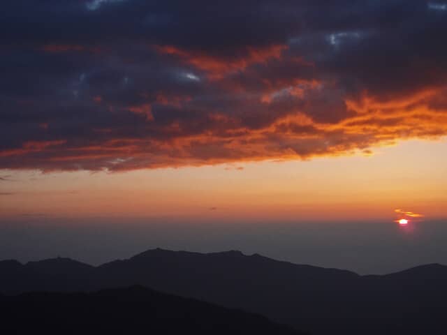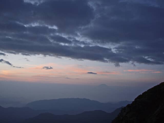 翌朝まだ暗い中、早くに起き出し、隣のこれもまたあまり知られていない日本第3の高峰、間ノ岳への縦走に出発した。しばらくすると夜が明けてきて、空気全体が薄いオレンジ色に染まり始める。頭上に雲海の底が果てしなく広がり、オレンジ色の蓋をしている。眼下の底には、まだ光が差し切れていない暗闇が沈み、その蓋と底の間に頭を出す富士山が見えた。振り返ると、まだ光が届いていない北岳の影が見える。