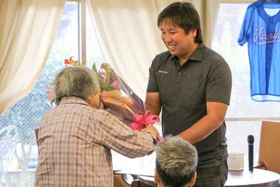 今回は「SOMPO認知症サポートデー」の一環として、台風15号で停電の被害に遭われた千葉県千葉市の老人ホーム「SOMPOケア そんぽの家 都賀」と船橋市の「SOMPOケア ラヴィーレ津田沼」に、元千葉ロッテの里崎智也氏が慰安訪問し、トークショーが行われた。