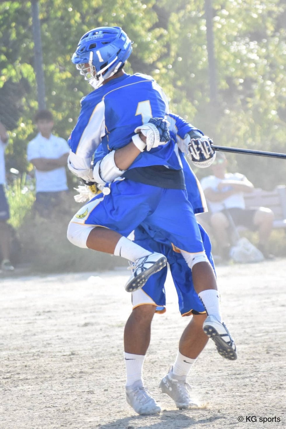 <写真・得点が決まり、仲間と喜ぶ武藤> 10月5日、立命館大学BKC第3グラウンドにて第30回関西学生ラクロスリーグ…