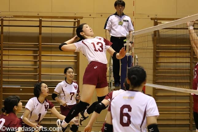 秋季関東大学リーグ戦(秋季リーグ戦)を4勝1敗の2位という好位置で折り返した早大は、桜美林大との一戦に臨んだ。第1セットは桜美林大を追う展開が続いたが、土壇場で同点に追いつき何とかセットを奪った。その後も、昨季まで1部で戦っていた実力のある相手に苦戦し競り合う展開が続いたが、要所でブレイクを奪いセットカウント3-0(28-26、25-19、25-21)でストレート勝ちを収めた。
