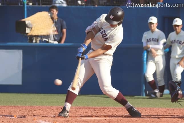 初回、中川卓の二塁打などで2死満塁とすると、田口が押し出し四球を選び先制に成功する。3回にも中川卓の二塁打などで2死一、二塁とし、ここでも田口が変化球をうまく拾い2点適時二塁打を放つ。リードを3点に広げた。前カード明大戦に引き続き、好調・田口のバットが打線を勢い付けた。その後さらなる追加点を得て東大を突き放したかったが、7回に訪れた1死満塁の好機では.000が一ゴロの併殺に。5回以降はわずか1安打のみと、明大戦で復活の兆しを見せた『打棒早稲田』は鳴りを潜めた。