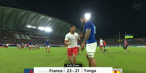 時間がなくなってきたトンガは接点で力勝負に持ち込む。最後まで攻めの姿勢を見せ、後半39分にキックパスからFLザネ・カペリがトライ、途中出場のSOラティウメ・フォシタのゴールが決まり2点差に追い詰めたが、時間が足りず23-21。スコアをひっくり返すには及ばずプール3連敗となった。