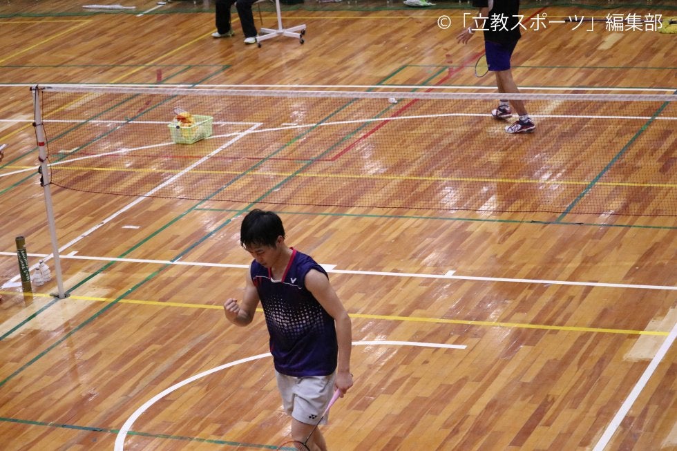 幸先のいいスタートを切った。開幕戦となった対法大Ⅱ部戦では第二ダブルスを接戦の末落としてしまうも、他ゲームを相手に1セットも与えずに快勝する。続く第2試合の対戦相手はスポウェル大。第1シングルの塚本(コ2)と第2シングルスの西林俊(コ3)は圧倒的な力をみせ、ストレート勝ち。2―0で第1ダブルスを迎えた。第1ダブルスに出場した白川(済3)・西林政(コ1)はインカレ出場を決めたほどの実力をもつペア。相手を全く寄せ付けず、2セットを奪った。第2ダブルスに臨んだ原(法3)・吉野(観2)ペア。原は第1試合の敗因について「気持ち負けだった」と語り、第1試合と第2試合の間に2人で声を掛け合い、気持ちを高め試合に臨んだ。第2試合では2人の連携もうまくいき、5連続でポイント奪い1セット目を先取した。迎えた第2セット。何度もスマッシュを決め、得点を奪った。しかし後半ではミスが増え、20−22となり第2セットを落としてしまった。