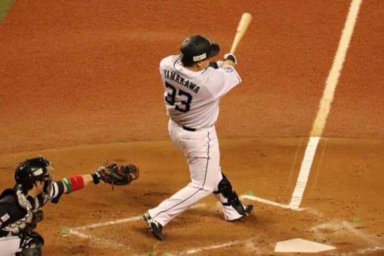 先発・ニールが無死満塁のピンチで内川を遊ゴロに仕留めた直後に、西武が大きな追加点を挙げた。5回途中から登板した3番手・高橋純から外崎が左前安打で出塁すると、続く山川が1ボールから外角高めの直球をバットの先で左中間に運ぶ二塁打を放った。左翼手・グラシアルがボールを弾く間に、一塁走者・外崎が一気に生還。中盤に欲しかった追加点をもぎとり、リードを2点に広げた。
