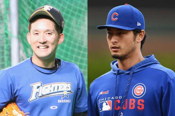 日本ハム・杉谷拳士(左)とカブス・ダルビッシュ有【写真:石川加奈子、Getty Images】