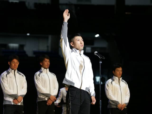 開会式には1日目のメインレース(12R)となる日本競輪選手会理事長杯を走る9選手に加え、敢闘宣言の任を受けた地元の蕗澤鴻太郎(S2・群馬111期)、本開催20回連続出場表彰の金子貴志(S1・愛知75期)らが参加した。