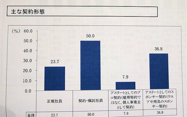 同調査によると、リオ大会出場97人、ソチ大会14人の合計111人に対して実施した結果、68.5%の人が「ある」という回答を得た。その内訳は、「契約・嘱託社員」が50.0%で最も多く、次いで「アスリートとしてのスポンサー契約(ウエアや用具のスポンサー契約)」が36.8%、「正規社員」が23.7%。