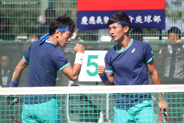 ダブルスはここまでの2戦と同様のオーダー。しかし、早大は序盤から苦戦を強いられた。ダブルス1の古賀大貴副将(スポ4=大分舞鶴)・安上昂志(スポ4=福岡・柳川)組が福田真大・今村昌倫組に対しストレートで敗れると、髙村佑樹主将(スポ4=千葉・東京学館浦安)・田中優之介(スポ3=埼玉・早大本庄)組もフルセットの接戦を落とし、早大は2勝の先行を許す。島袋将副将(スポ4=三重・四日市工)・千頭昇平(スポ3=愛知・誉)組が川島颯・羽澤慎治組を下し1勝を持ち帰ったが、早大は今季の団体戦で初めてダブルスを負け越してシングルスへと折り返した。
