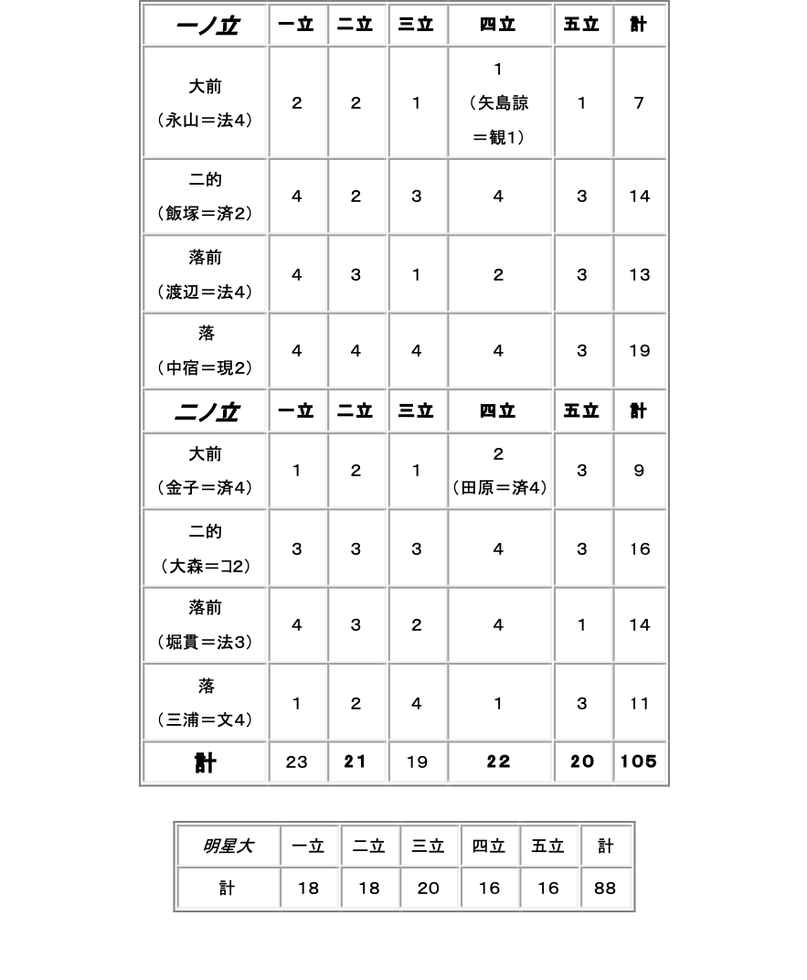 1立目から8人中4人が皆中を決め、出だしは好調。2立目も立大は安定した的中率を保ち、さらにリードを広げた。3立目では18中―21中と失速し差を縮められたが、この状況でチームを支えたのは中宿(現2)だった。抜群の安定感をみせ、1立目から4立目まで皆中を決めた。その時の心境について中宿は「いつも通り。試合なので多少力むことはあるが、引けば当たると思った」と語った。己を信じ引き続け迎えた5立目。惜しくも1射目を外し、すべての立で皆中とはならなかったが、チームを支え大いに勝利に貢献した。合計得点は105中‐88中となり、見事白星を飾った。
