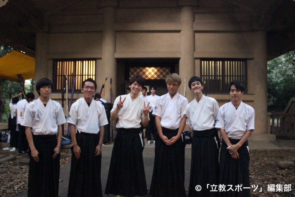 今試合で皆中した選手たち。左から堀貫(済2)、飯塚(法4)、中宿(現2)、高森(理1)、三浦(文4)、渡辺(済3)