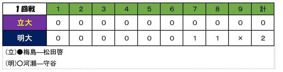 好投を続けていた梅島だが、7回に2死から三者連続で安打を浴びて先制点を献上してしまう。8回にも暴投などで1点を失い、2点ビハインドで最終回へ。先頭の梅島、中澤(社3=立教英国学院)が安打で出塁。一打同点の場面を手にするも、後続が続かず、完封を喫した。得点圏に走者を進めるも、高校時代に関東大会優勝経験のある相手先発・河瀬の前にあと一本が出なかった。先発・梅島が好投していただけに、悔しさの残る試合となった。終わってみれば2−0。それほどの大差ではない。昨秋・今春と2連覇を果たした明大との戦力差はさほどないほどを示した。リーグ優勝・東日本大会出場を目指して、これからも汗を流し続ける。
