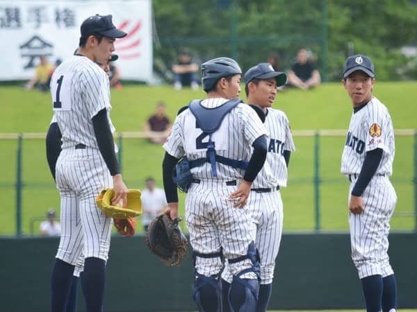 サヨナラ負けのピンチを迎え、マウンドに集まる大船渡ナイン