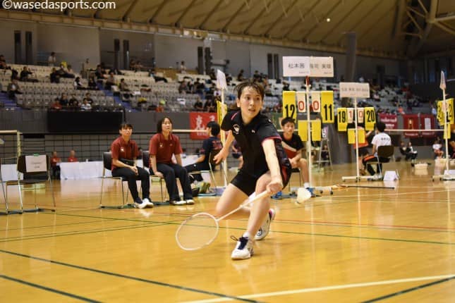 インカレの個人戦に初出場を果たした松本茜(社4=福岡・九州国際大付)。1回戦は緊張から動きが硬くなっていたが、試合が進むにつれて本来のプレーを発揮し、ストレート勝ちを収める。続く2回戦では西日本学生選手権シングルスで優勝した落司(龍谷大)との対戦。勝負は第2ゲーム終盤だった。第1ゲームを奪ったものの8点ビハインドで迎えた相手のゲームポイント。ここから怒濤(どとう)の追い上げを見せる。しぶとくラリーを続け、甘くなった返球を見逃さずにプッシュを押し込み、7ポイント連取。あと1点でジュースに持ち込めるところだったが、「欲が出ちゃったのかなと思います」という言葉があったように、決め急いでスマッシュをネットにかけてしまう。続くゲームも相手に先行されるかたちで展開され、パワーのあるスマッシュに苦戦し18-21。松本の挑戦はここでついえた。