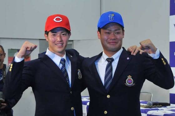 明大の森下暢仁(左)は広島が1位指名、伊勢大夢はDeNAが3位指名となった【写真:篠崎有理枝】