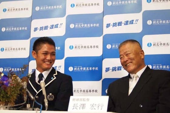 阪神から1位指名を受けた創志学園・西純矢(左)と野球部監督の長澤宏行氏【写真:編集部】