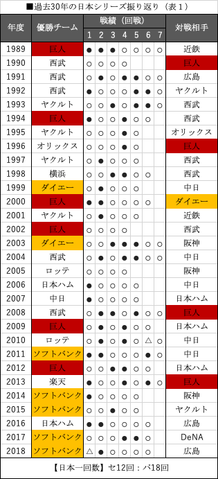 平成時代の過去30年間を振り返る(表1)と、巨人が出場10回で日本一6回、ソフトバンク(ダイエー時代も含む)は出場8回で日本一7回を誇る。両者の直接対決は2000年の1度のみで、実に19年ぶりとなる。
