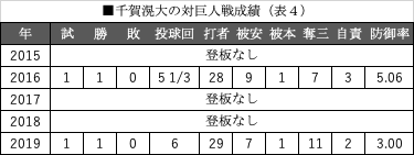 千賀は過去5年間で巨人戦2試合に登板(表4)。2勝0敗と勝利し、三振も奪ってはいるが、ヒットを数多く打たれ、失点も喫している。