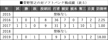 一方の菅野は過去5年間でソフトバンク戦3試合に登板(表5)。2017年6月13日の対戦で3安打1失点の快投で完投勝利を収めたが、今年6月23日の対戦では初回に4失点(自責2)を喫して自身プロ最短となる1回0/3で降板した。