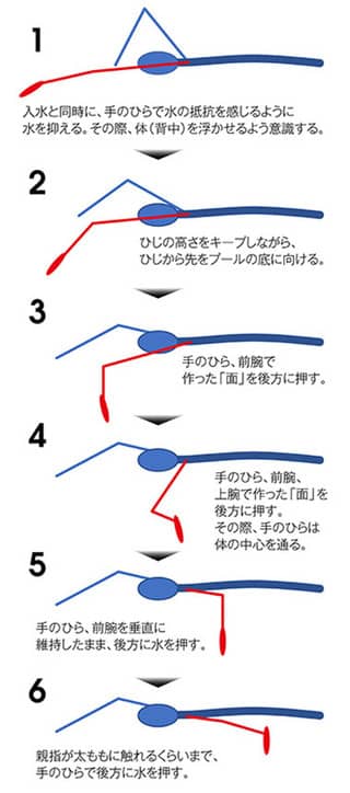 また、手を入水する際は、手のひらで水の抵抗を感じるように水を抑えることを意識してください。その抵抗を感じたまま手の先を底に向けて、手のひら、前腕、上腕で『面』を作るようにして水を最後まで後方に押します。そういった動きを意識しながら、もう一度やってみましょう。