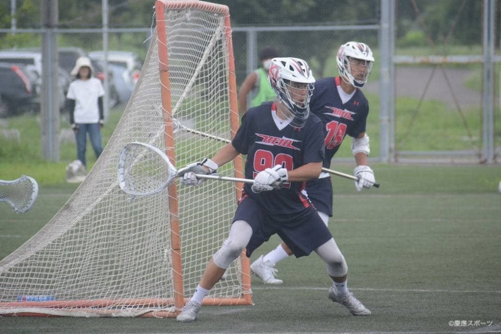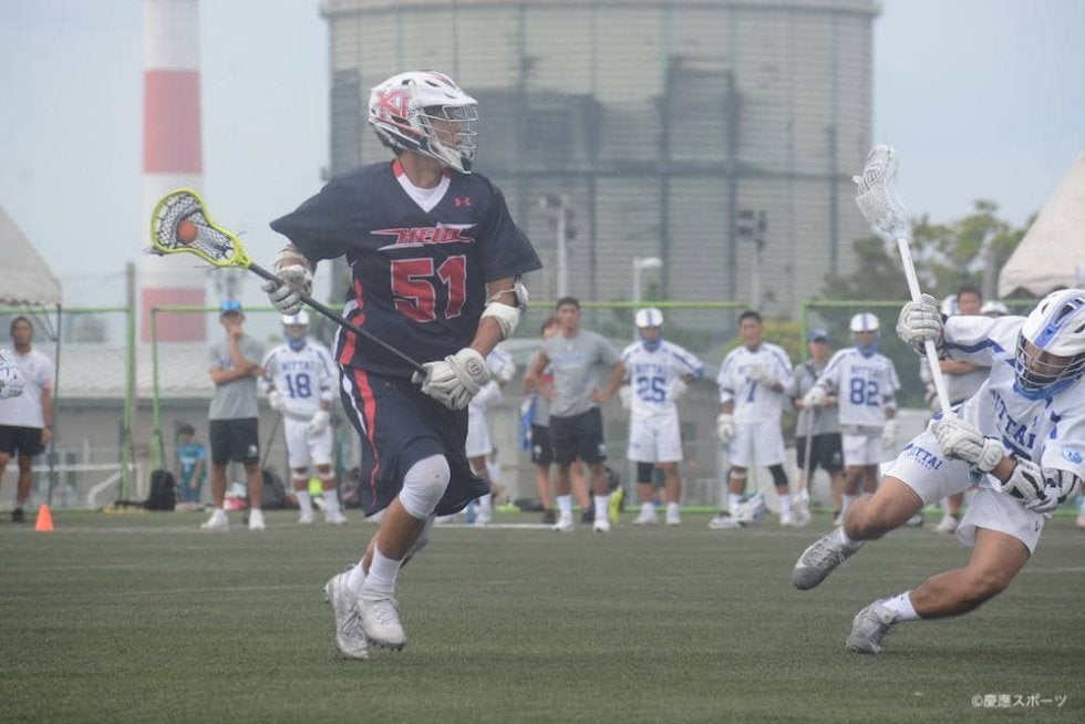 1Q。試合開始のフェイスオフでポゼッションを取られると、パス回しで撹乱されマークが甘くなった日体#55にスタンシューを決められあっさり先制点を奪われる。しかし、直後に相手のプッシングでエキストラマンオフェンスの状況を作ると、ボールを持った江原健(#1・経4・慶應)が右上の立石真也(#3・法3・慶應)にパス、勢いに乗ったまま1人躱して放ったシュートが日体ゴールに突き刺さり、すぐさま同点に追いつく。さらにその3分後、ゴール前に溢れたボールを田村脩眞(#9・法2・慶應)がクロスで押し込み逆転に成功した。