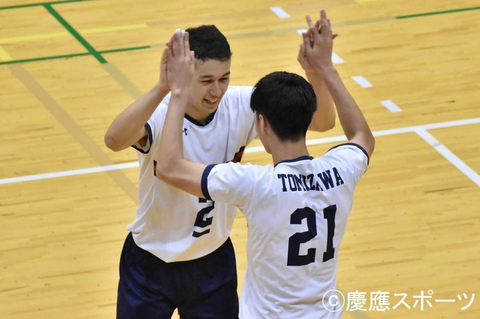 優勝を左右する大事な一戦は、第1セットから激しい点の取り合いとなった。試合序盤、小出捺暉(環2・駿台学園)と清水柊吾(総3・広島城北)の活躍で4点のリードに成功。慶大が流れをつかんだかのように思えたが、中盤以降は両者ゆずらない展開が続いた。試合はデュースへともつれ込み、ついに得点は30点台へ。互いにブレイクを奪うことができず、緊迫した状況であったが、終盤にはマルキナシム主将(総4・川越東)のスパイクが次々と決まった。最後は相手のスパイクがミスとなり、慶大が36-34でセットを先取した。