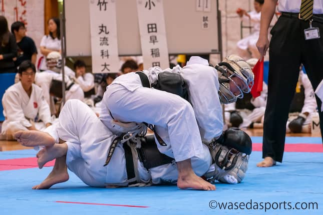 今大会は1試合3分間、二本先取で行われる。また3分後に同点であった場合は審判による判定で勝敗が決まることになる。最初に試合に出たのは杉井、対する相手は龍谷大の格下の相手だ。開始直後からお互い激しく攻撃しあう展開となった。開始から26秒後に相手の一撃で一本を決められるも、その約40秒後には杉井の拳が相手の胴に入り、一対一となる。なおも攻撃の手を緩めることなく攻め合っていたが、残り1分19秒で相手の面突きを食らってしまいここで試合終了。1回戦敗退となった。初段の小田は流科大の格上の選手との対戦。開始30秒後には得意の押さえ込みで相手をひっくり返すとそのまま面を突いて一本を奪い取った。このままの流れで勝利をつかみたかったが、この45秒後に今度は相手からの突きを受け一本を献上してしまう。なおも強気で挑む小田。残り50秒のところで相手の足をつかみ持ち上げようとした。これで押さえ込みに持ち込めるかと思われたものの、それほど相手も甘くはない。小田が足を掴んでいるために両手が使えないところを狙って面突きを決められ、敗退となった。